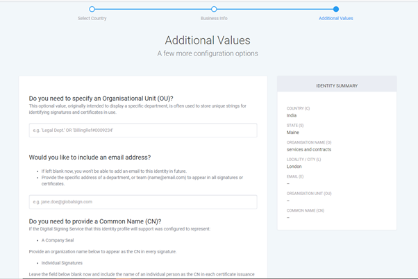 Enter in the additional information such as Organizational unit, common name and an email address. While you may skip providing organizational unit and an email address, but we do recommend you providing in a common name.