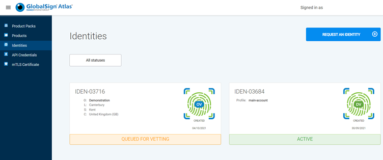 The identity and it’s status is visible on the Identity page.