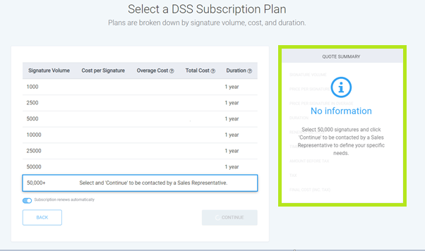 Select the 50,000+ License Plan from the menu by clicking on that row, then click on CONTINUE. Note, you will see that you are not able to enable the automatic-renewal during the ordering process. You will only have this option on an Active Service (after you have accepted your quote and purchased the service).