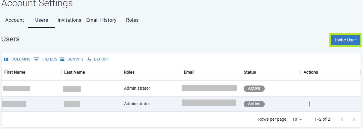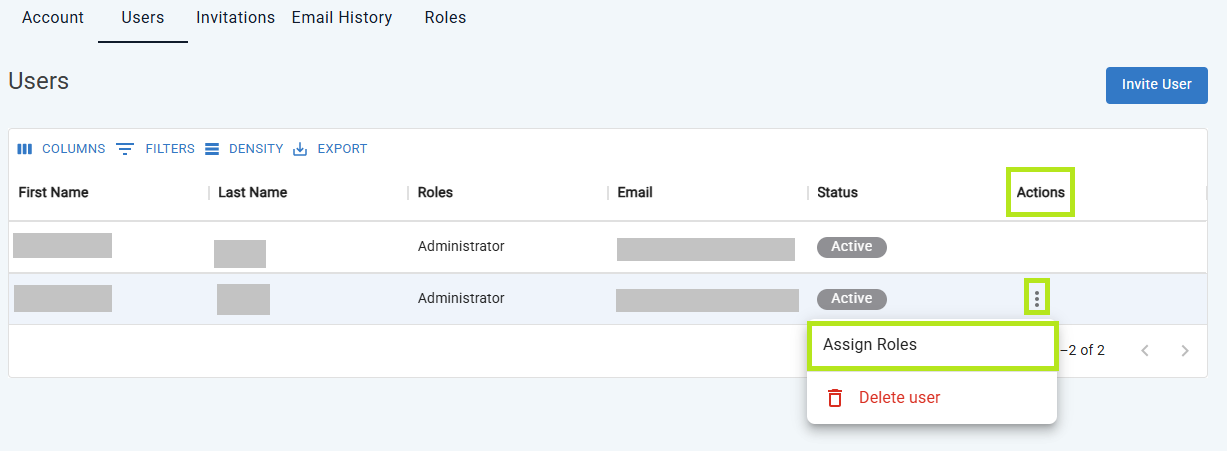 • Administrator – The default role for the first user of an Atlas account. This role has permissions to perform all actions within the Atlas portal. It is the only role with permissions to create and manage users and to assign roles.