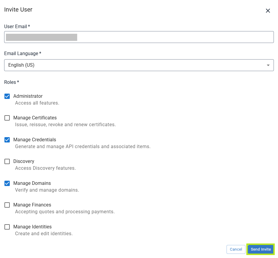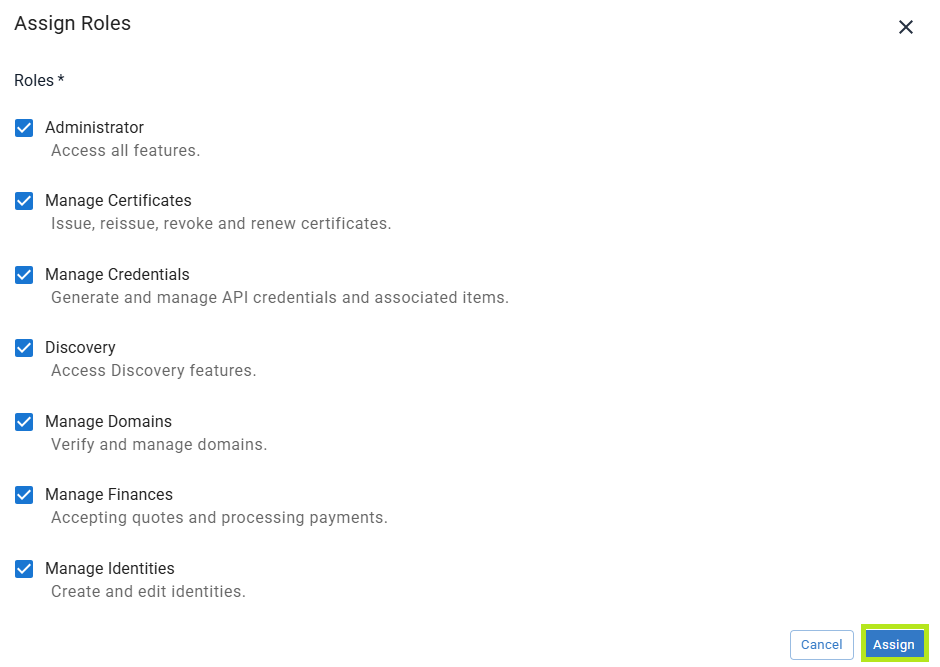 | Role | Assign Roles | Issue, reissue, revoke, and renew certificates | Generate and manage API credentials and associated items | Access Discovery features | Verify and manage domains | Accepting quotes and processing payments | Create and edit identities |