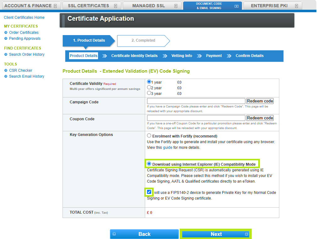 Select EV Code Signing and Standard Code Signing from the product group, then select Extended Validation (EV) Code Signing from the Select Product drop-down. Then, click Next.