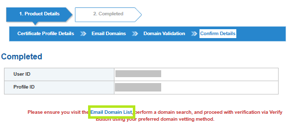 WHAT'S NEXT: You can now verify your domain. You can either click on the Email Domain List in the acknowledgement screen or refer to this page to proceed with Domain Verification Process in EPKI. |