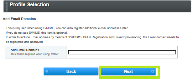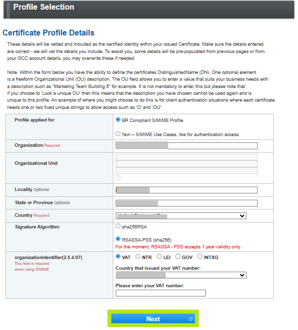 In the Certificate Profile Details, fill out the required fields with your organization information. Then, click Next to continue.
