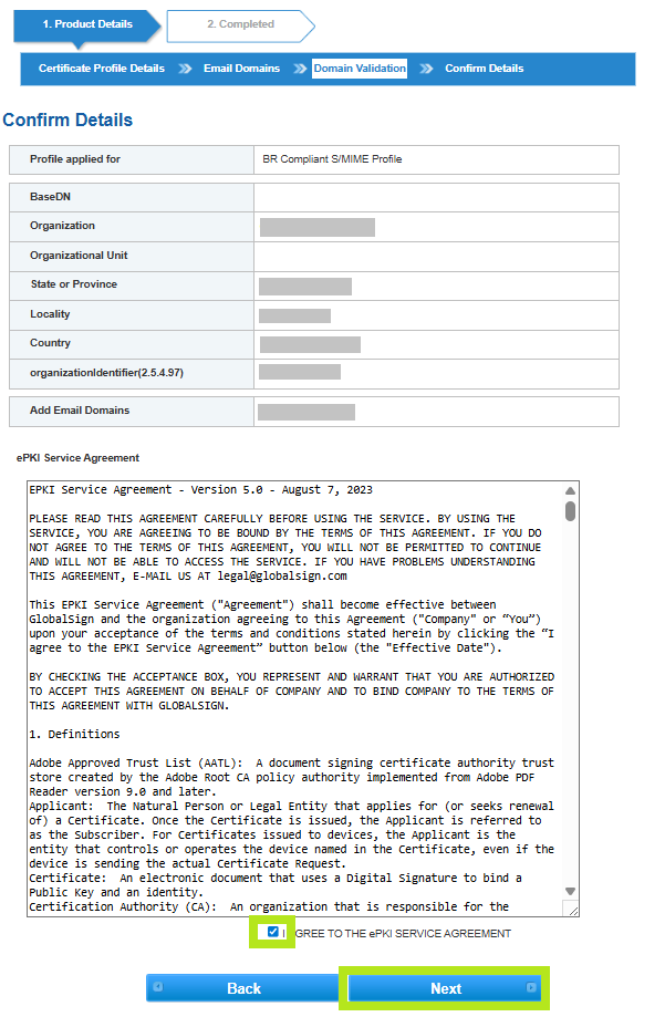 Review all the information you supplied and tick the I Agree to the EPKI Service Agreement box. Then, click Next to proceed.