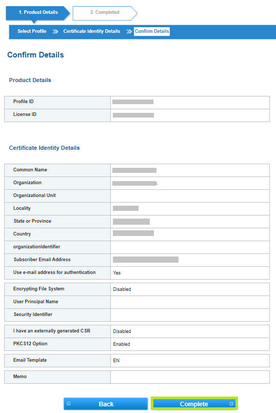 In the Certificate Identity Details screen, enter your information in the required fields.