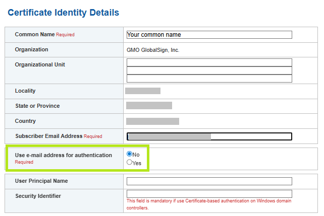 IMPORTANT: In Use e-mail address for authentication section, choose Yes if you wish the Certificate to use both client authentication and email address authentication. Choose No if you will only use client authentication. |