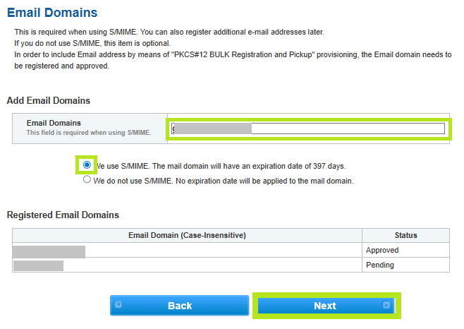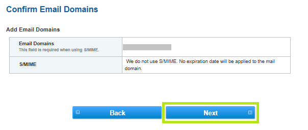 Enter your common name or email domain and tick "We use S/MIME...." button. Then, click Next.
