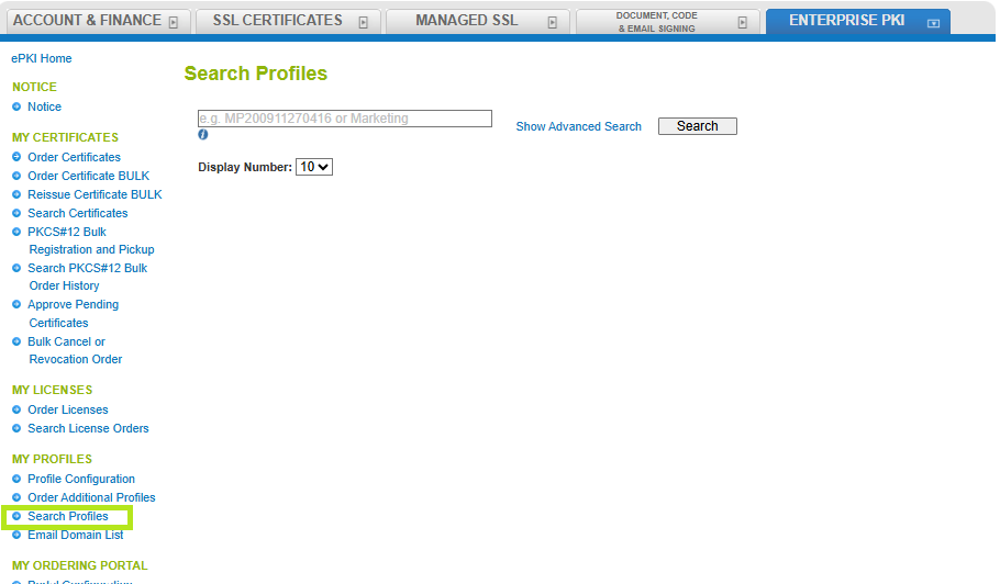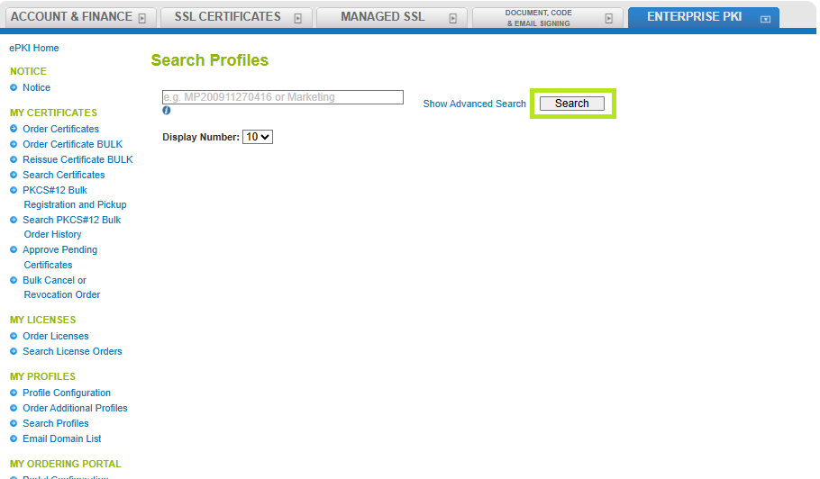 Enter the Order ID in the search screen or simply click the Search button to populate all certificate orders.