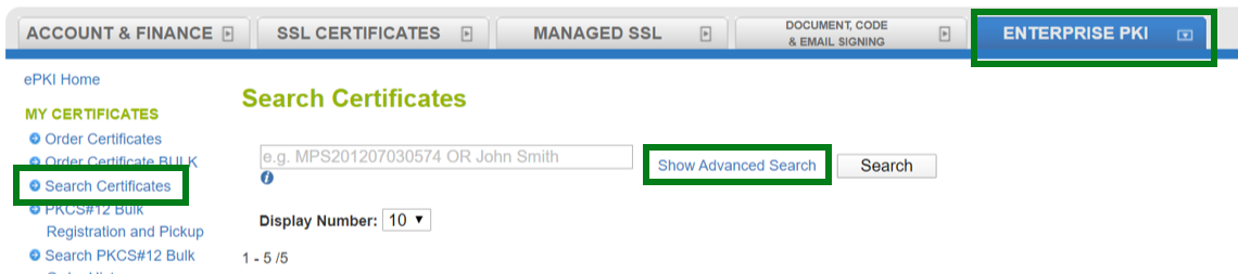 - Haga clic en la pestaña superior etiquetada: Enterprise PKI y haga clic en "Buscar certificados" en el menú del lado izquierdo. Luego haga clic en "Mostrar Búsqueda Avanzada".