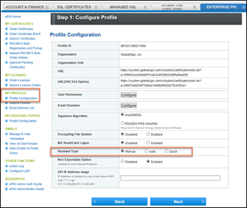 Hay tres configuraciones de renovación disponibles para el administrador de EPKI en el nivel de perfil de EPKI: