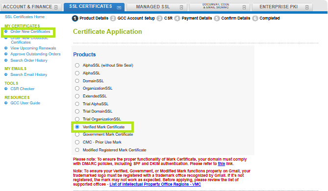 OVERVIEW: This page walks you through the process of ordering a new GlobalSign's Verified Mark Certificate (VMC). VMC allows organizations to display their trademarked logo next to their emails in supported inboxes (like Gmail). It confirms that the sender’s identity and logo have been validated by a trusted Certificate Authority. At the completion of this procedure, you will be able to place an order for your VMC. |