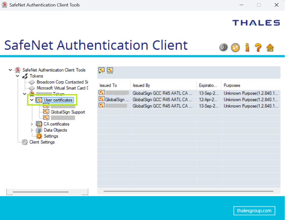 No lado esquerdo, sob o nome do token, clique no menu suspenso User Certificates (Certificados do usuário) para visualizar os certificados disponíveis.