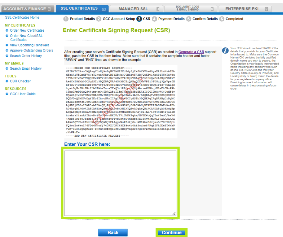 Digite seu CSR na caixa designada e clique em Continue (Continuar). Observação: a GlobalSign não oferece mais suporte ao AutoCSR.