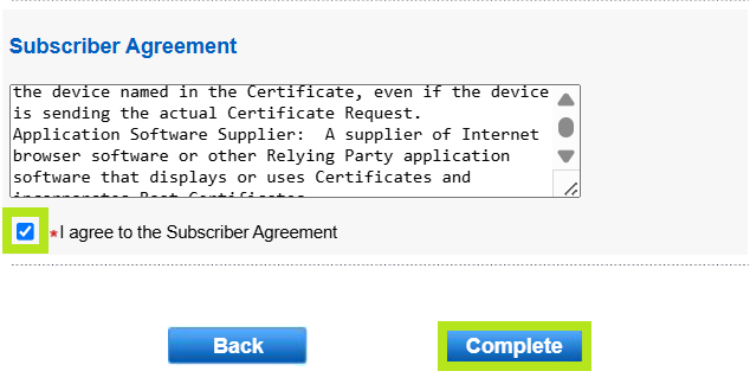Revise todas as informações fornecidas e, em seguida, marque "I agree to the Subscriber Agreement" (Concordo com o Contrato de Assinante) e clique em Complete (Concluir).