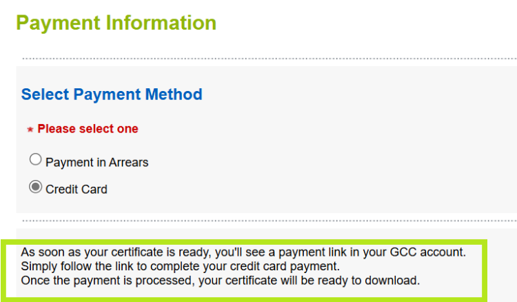 IMPORTANTE: Para pagamentos com cartão de crédito, você receberá um e-mail com um link para processar o pagamento antes que o certificado seja emitido. Esse link de pagamento está disponível no portal do GCC. Para obter instruções sobre como processar o pagamento do seu certificado, consulte este guia em. |