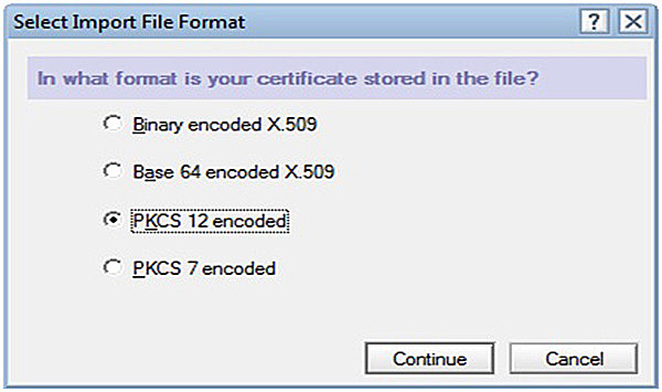 Selecione PKCS # 12 codificado e clique em Continuar.