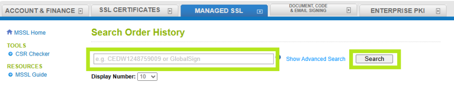 Digite o ID do pedido na tela de pesquisa ou simplesmente clique no botão Search (Pesquisar) para preencher todos os pedidos de certificado.