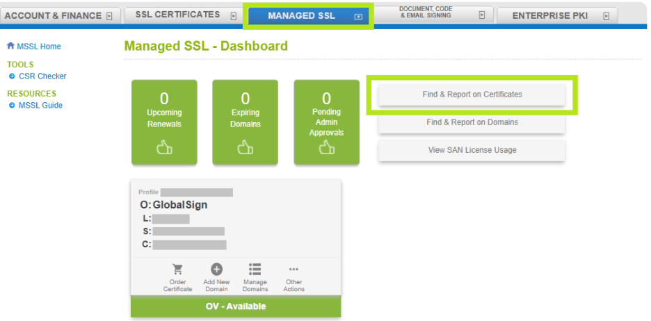 Clique na guia MSSL e, em seguida, clique em Find & Report on Certificates.