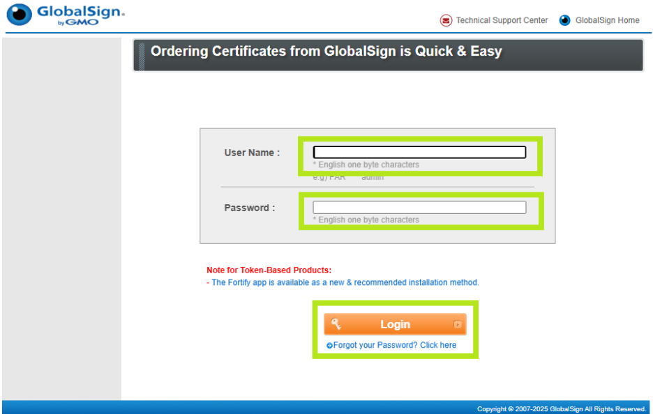 Faça login na sua conta GCC da GlobalSign com o nome de usuário.