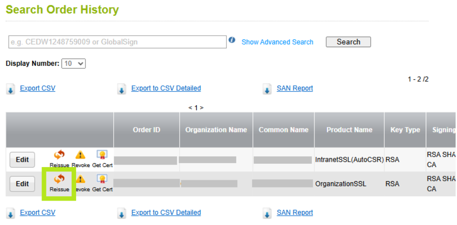 Selecione o certificado que deseja reemitir e clique no botão Reissue (Reemitir). Essa ação o levará às páginas de pedidos.