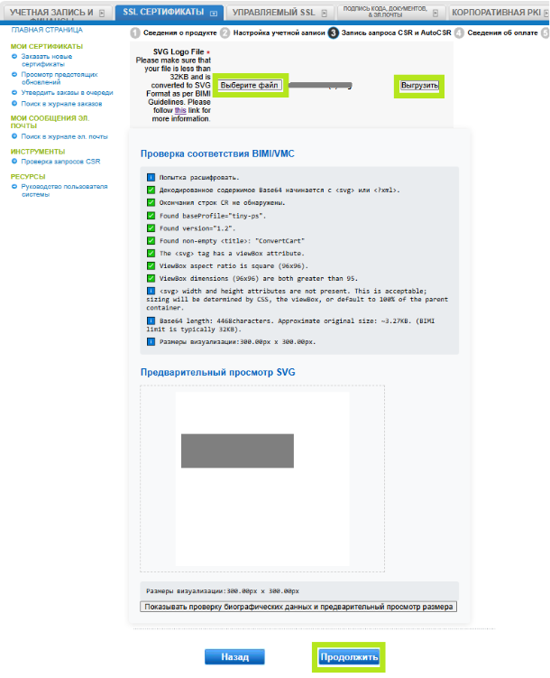 Наша команда по проверке свяжется с вами, когда это будет необходимо. После проверки ваших доменов и подтверждения данных вашей организации и логотипа с нашей стороны, мы отправим вам по электронной почте файл PEM с вашим сертификатом марки.