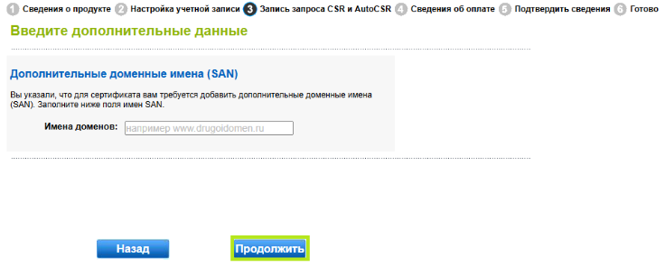 Если вы выбрали «Да» для добавления SAN, вам будет предложено ввести дополнительные домены, для которых вы хотите использовать CMC. Затем нажмите «Продолжить».