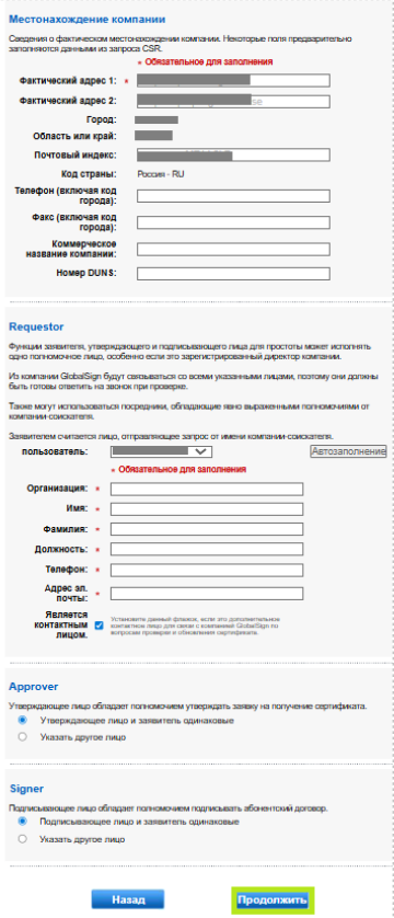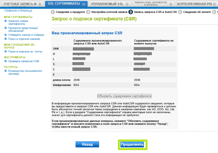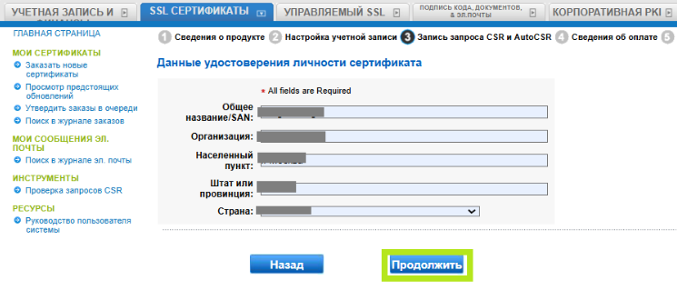 В поле «Данные удостоверения личности сертификата» укажите свое основное имя/SAN, организацию, населенный пункт, штат или провинцию и страну. Затем нажмите «Продолжить».