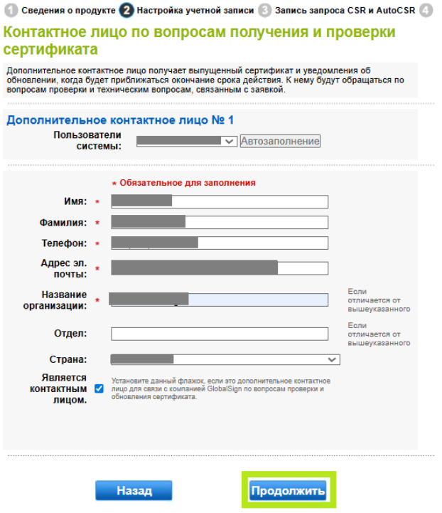 В поле «Дополнительное контактное лицо № 1» введите свои контактные данные, которые будут использоваться для дальнейшей связи. Затем нажмите «Продолжить».