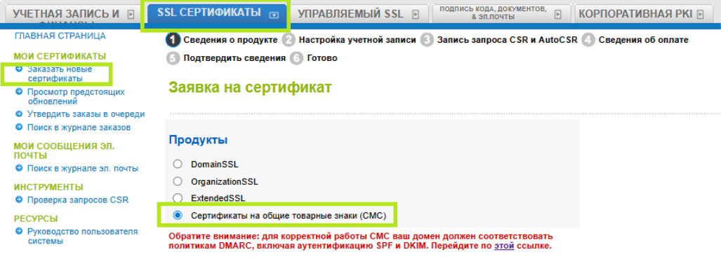 В разделе «Мои сертификаты» нажмите «Заказать новые сертификаты» и выберите «Cертификаты на общие товарные знаки (CMC)».