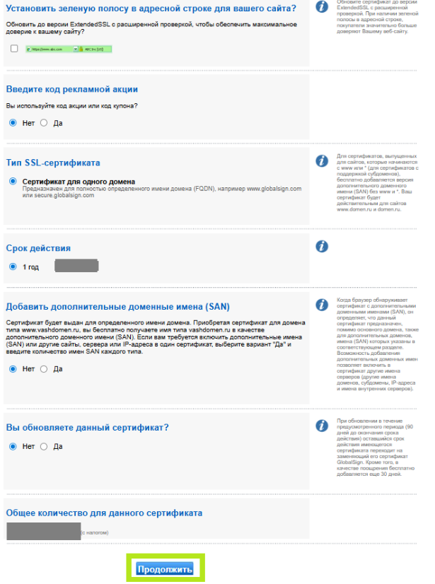 В том же окне выберите «Да» в поле «Добавить дополнительные доменные имена (SAN)», если вам нужно добавить несколько доменов в свой заказ. Затем нажмите «Продолжить». Примечание. Если оставить значение «Нет», по умолчанию вам будет предложено добавить только один домен, который может быть вашим основным доменом.