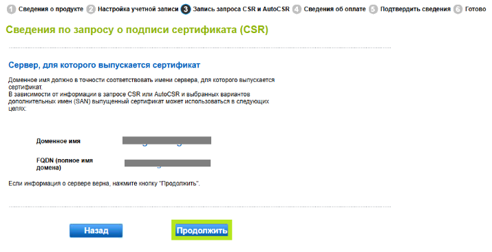 В окне «Сервер, для которого выпускается сертификат» вы можете просмотреть сводку FQDN, запрошенного для вашего CMC. После подтверждения нажмите «Продолжить».