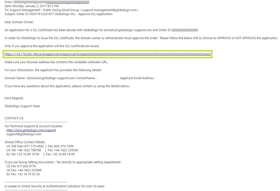 Центр сертификации GlobalSign (GCC) получит и будет использовать этот адрес, отображая его на странице для подтверждения домена.
