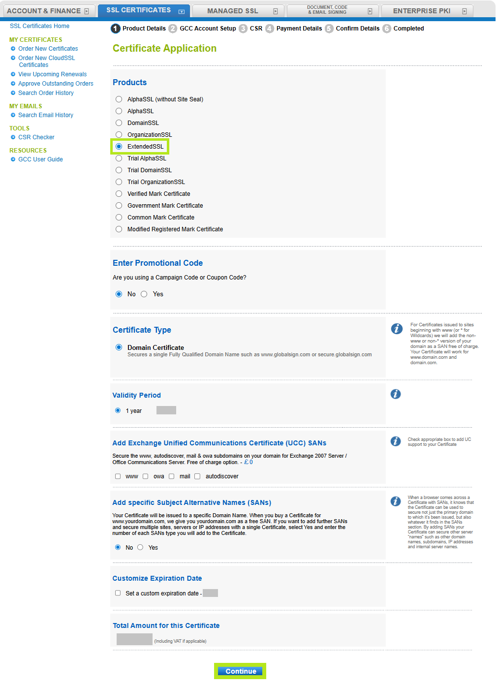 In the Certificate application window, select ExtendedSSL as your product and choose your preferred Certificate Type, Validity Period. Optionally, you can add SANs or customize the expiration date. If you have a promotional code, enter it in the designated field, then review the total amount displayed at the bottom of the page, and click Continue to proceed.